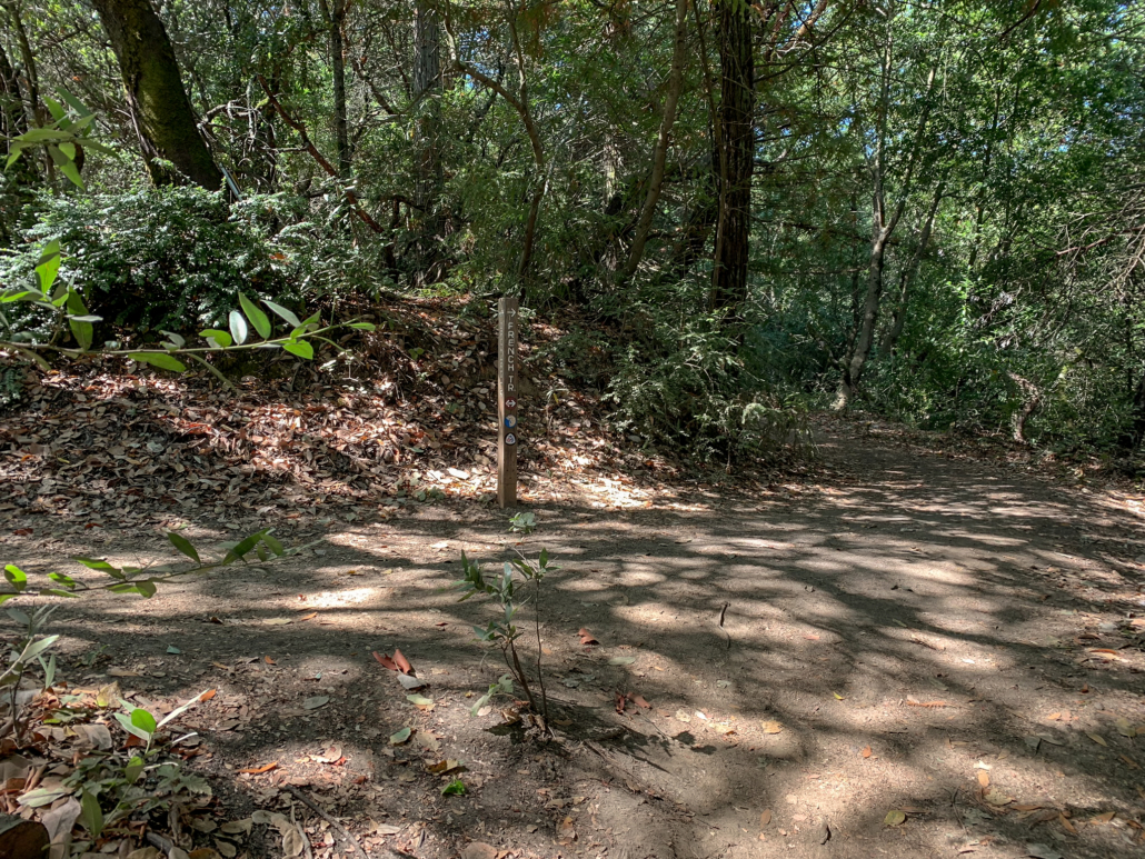 Technically, this part of the loop is in the Roberts Regional Recreation Area, a tiny, 82-acre East Bay park known for its redwoods. If you are up for more redwood exploring, you can take the signed Roberts Ridge Trail south for about 1.25 miles past the PAL cabins. A historical monument near the Madrone picnic area commemorates two redwoods that were so tall and distinctive, they served as navigational aids to ships passing through the San Francisco Bay in the early 1800s. In 1826, Captain F. Beechy in the Royal Navy recommended aligning the northern end of Yerba Buena Island between the two redwoods to avoid scraping against Blossom Rock, a hazard hidden beneath the bay between Alcatraz Island and San Francisco. The trees were 16 miles east of the ships, so you can imagine how tall they must have been! Those redwoods are long gone, as is the old growth redwood forest here, logged between 1845 and 1860 to support a growing San Francisco.