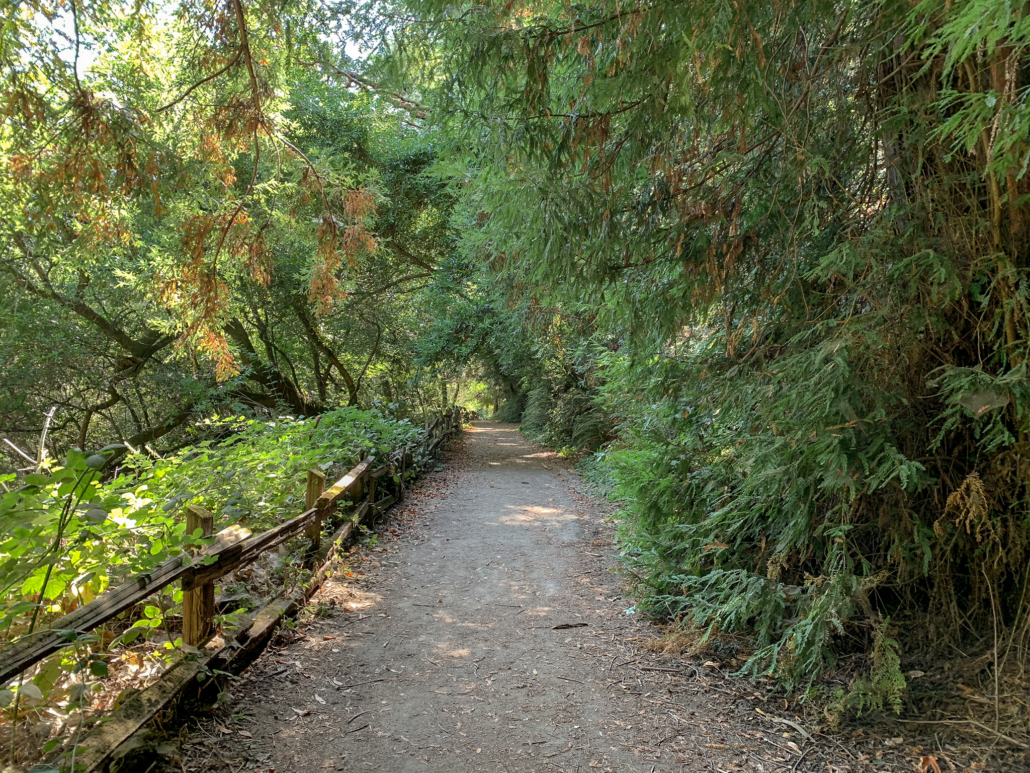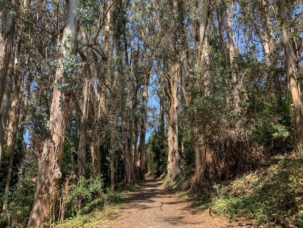 Passing through a tall eucalyptus grove on the West Ridge Trail.