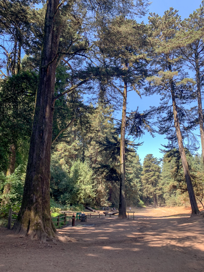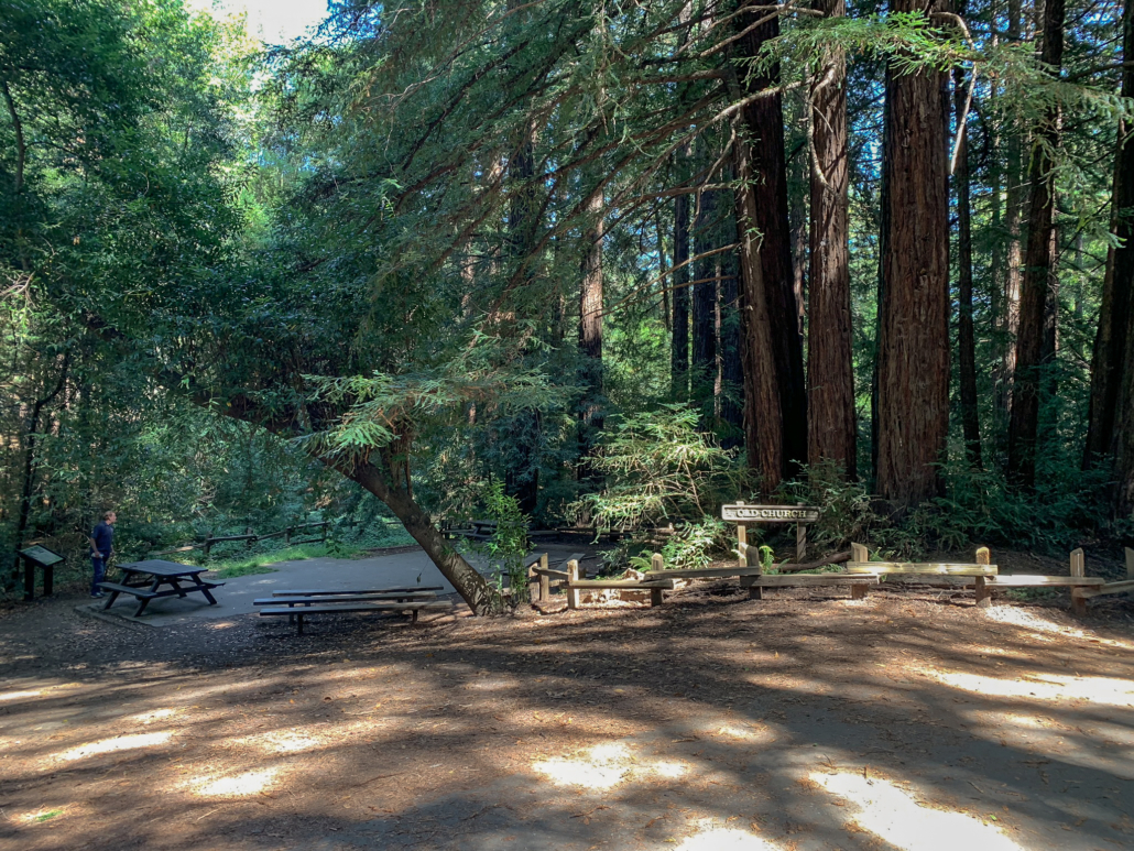 In 0.5 miles, visit Old Church on your left, a picnic area with an amphitheater and pew-like benches that feel like you are sitting beneath a redwood cathedral. Old Church is reservable and it is not hard to imagine a rustic wedding or special event here. Beyond Old Church, in 375 feet, reach the end of the loop portion of your hike at 7.5 miles, turning left cross the bridge over Redwood Creek back to the Canyon Meadow parking lot.