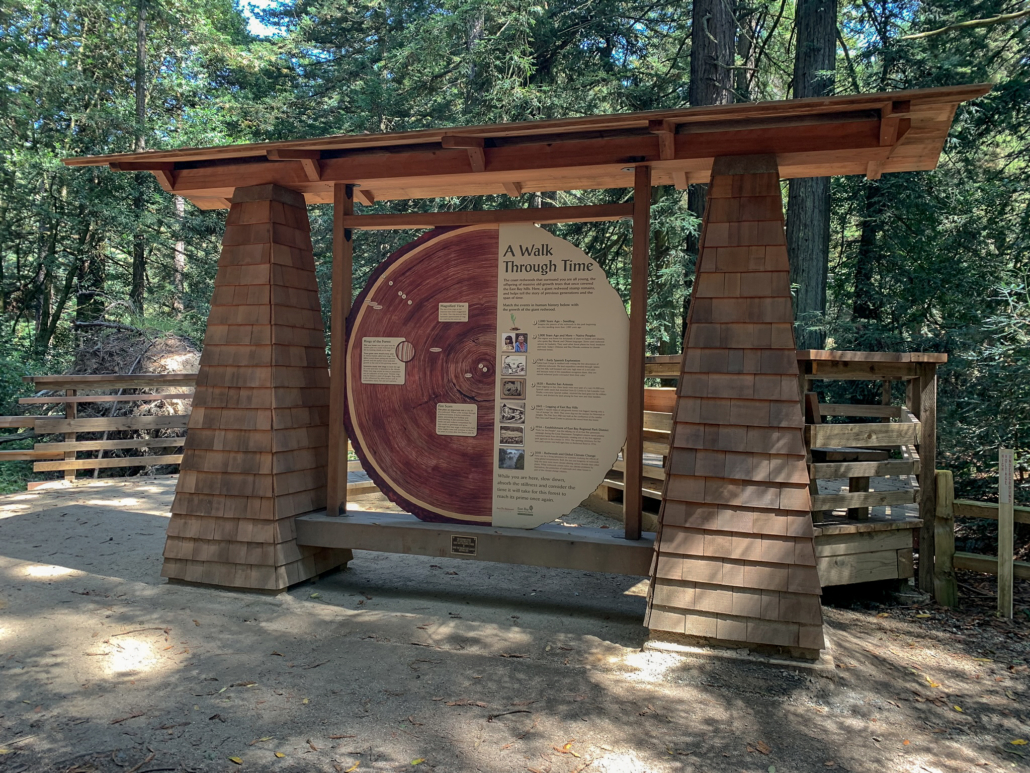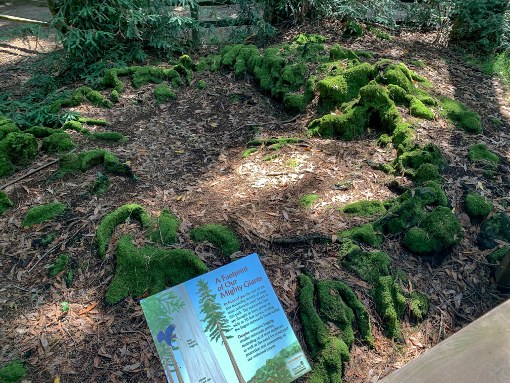 At 2.8 miles, arrive at Redwood Bowl, a picnic area with towering redwoods and picnic tables. Follow signs for West Ridge Trail through the junctions here, passing PAL cabins on your left. Oakland’s Police Activity League hosts Oakland youth at the cabins, giving them a chance to get away from the city. To the right, 500 feet past the cabins, is a delightful wooden deck and a brand new exhibit about the redwood forest. The deck has a peaceful viewpoint of the redwoods and overlooks a giant redwood stump; you get a feel for just how big the redwoods are that once grew here. This is a nice spot for a snack break, just over a third of the way through your loop.