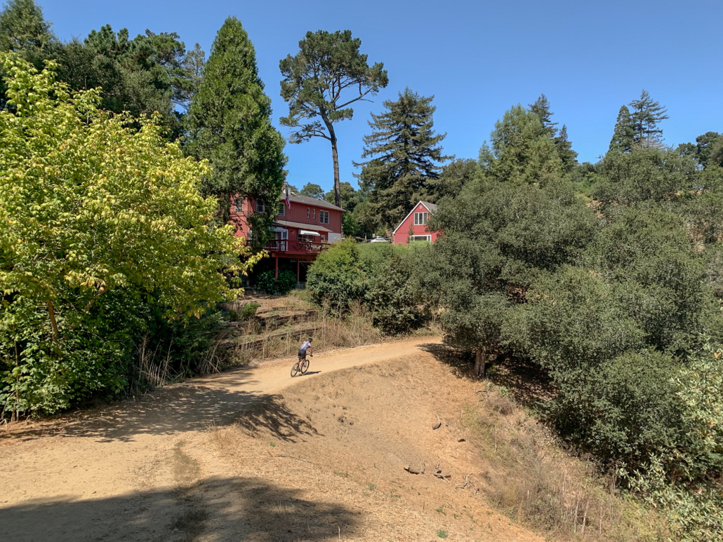 A mountain biker zooms by on the West Ridge Trail as it passes a residential area.