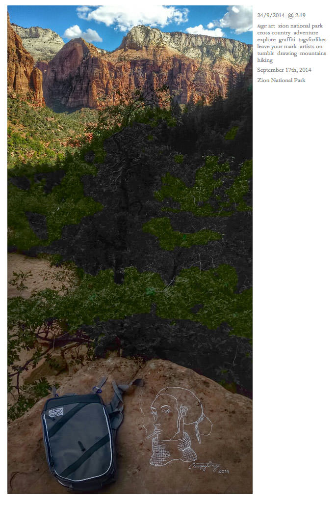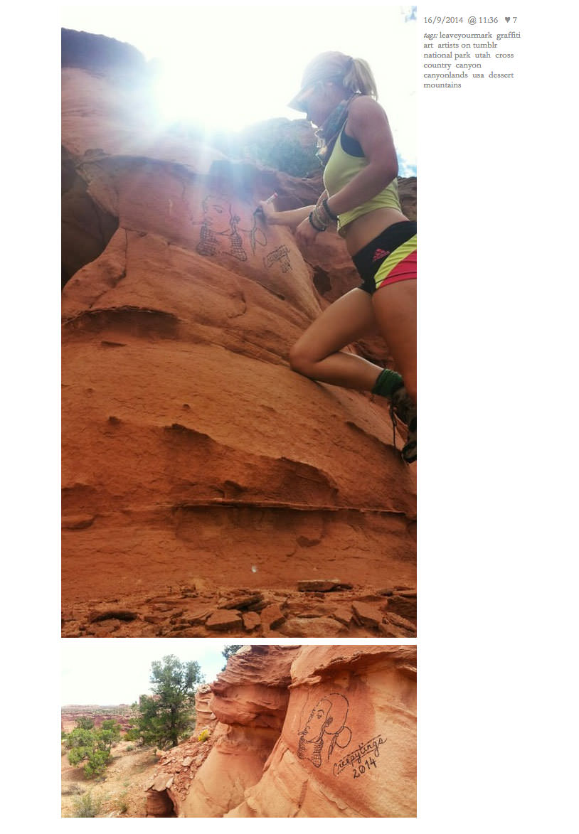 In either case, however, what Ms. Nocket is doing will not only get her some likes on Instagram, but will most likely result in a few felony vandalism charges once the Park Service catches up with her. And since, like most modern park vandals, she left a rich social media trail, it will likely only be a matter of time before that happens. Reddit already seems to be on the case. Update: Looks like Nocket’s Instagram account is now set to “Private.” All photos with paintings and Instagram conversations here were screen-grabbed from her account on the morning of October 21st. And yes, it also appears that she defaced Canyonlands and Zion on her trip. From her Tumblr blog: