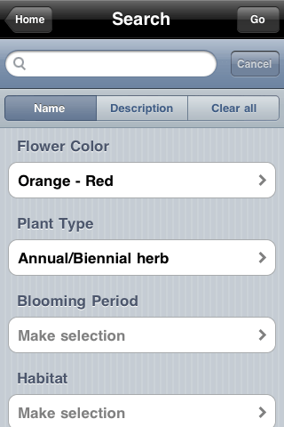 If you wanted to flash back to high school biology, you could also use an identification key-style search function, where drop-down menus let you input the flower color, blooming period, habitat, flower form, number of petals, and more. The App will give you every plant that fits the criteria.