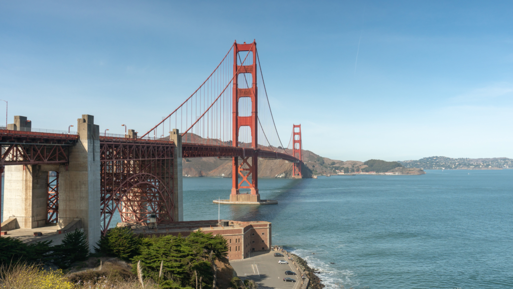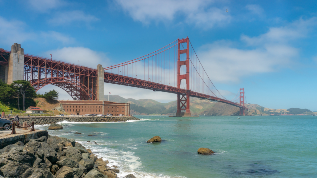 A beautiful vista of the Golden Gate Bridge and Fort Point along the Presidio Loop.