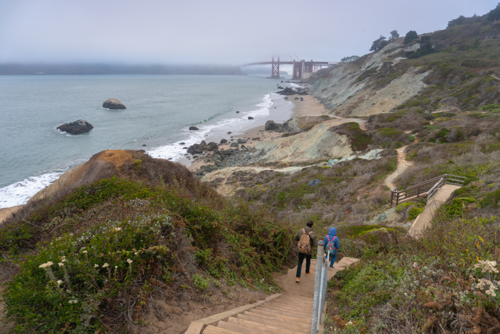 Hiking north along the Batteries to Bluffs Trail with a view of Marshall’s Beach, serpentine bluffs, and the Golden Gate Bridge.