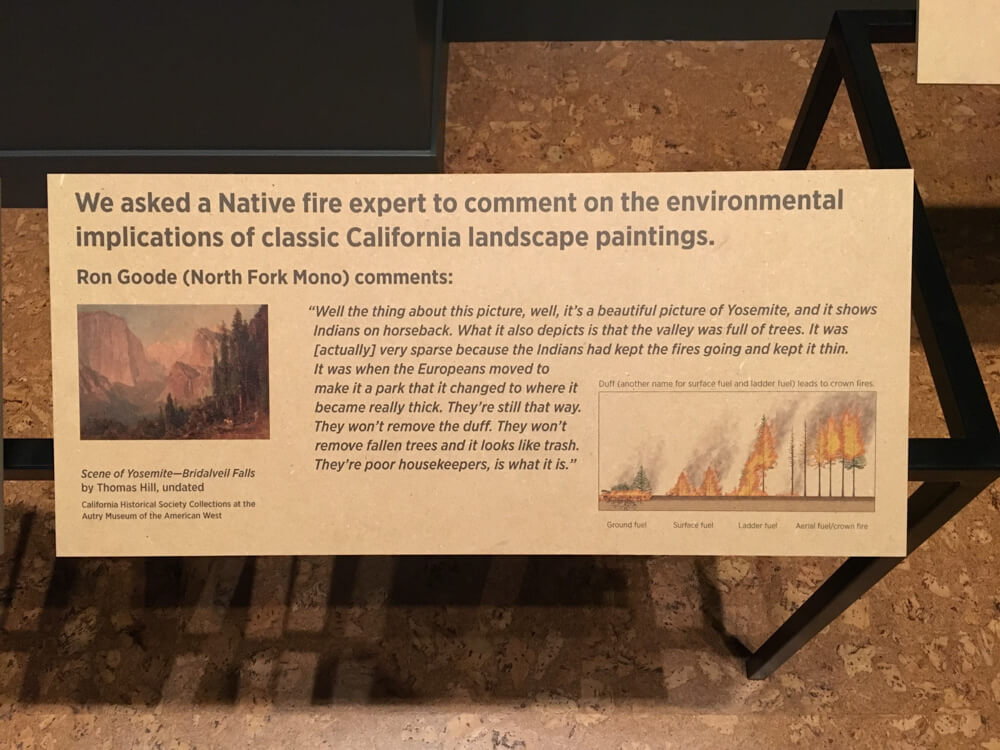 The Fire section is one that will be of special interest to hikers. Often times, we view wildfires as destructive to the landscapes we love and a nuisance to our enjoyment of the outdoors when our favorite trails are closed. In this section, visitors learn that native Californians had been setting what we now know as “controlled burns” in the forests all across the state long before Western foresters began promoting the idea that thick, dense forests were healthier.