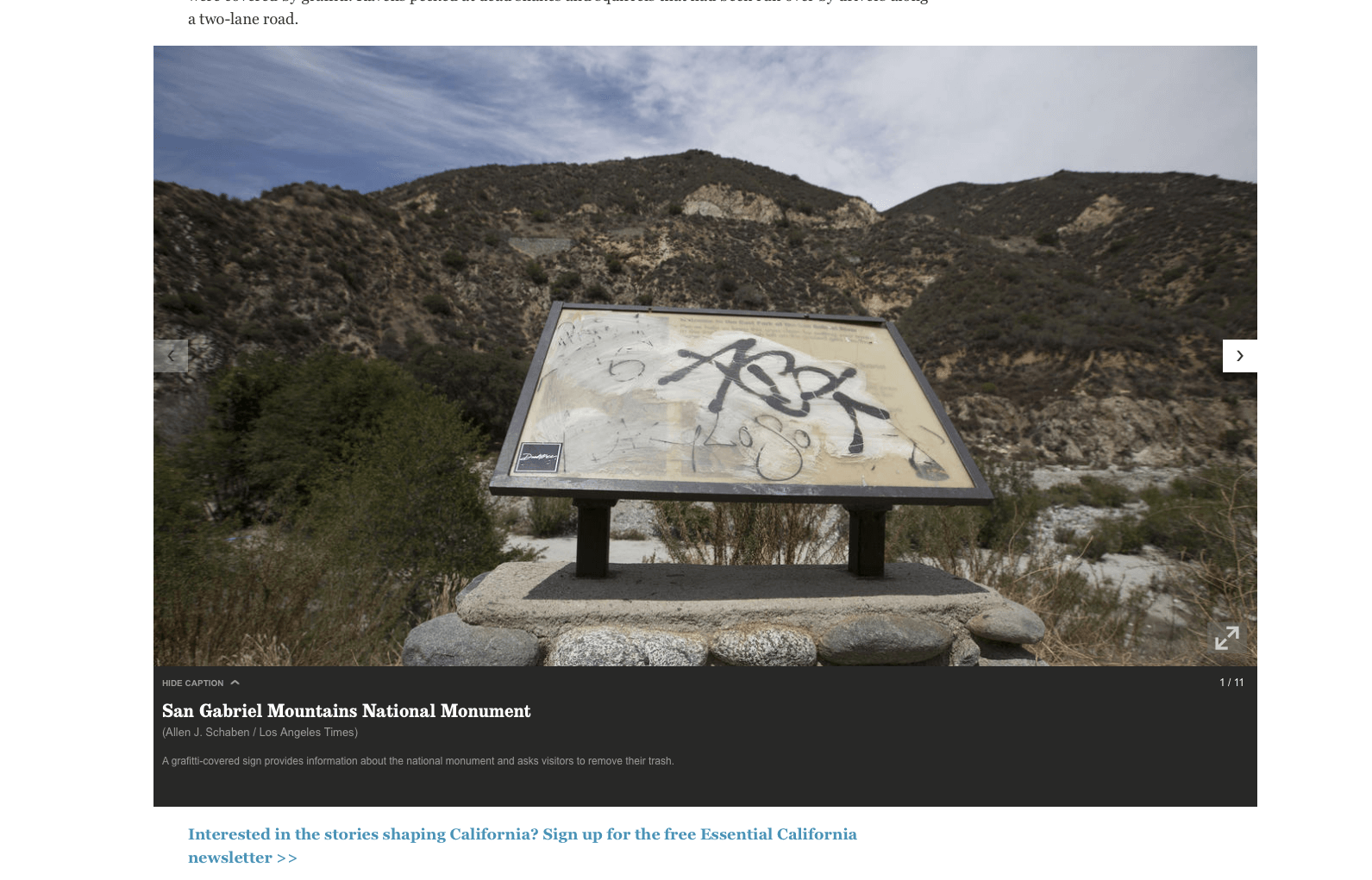 “Visitors to the San Gabriel Mountains can be forgiven if they see overflowing trash bins, broken marijuana pipes, graffiti and road kill and wonder what became of President Obama’s vision for the wilderness … Trash, broken beer bottles and other blight were present in abundance. Porta Potties and interpretive signs were covered by graffiti. Ravens pecked at dead snakes and squirrels that had been run over by drivers along a two-lane road … The only obvious indication of the historic designation was a sign, barely visible in the shade of six pine trees along California 39 just north of Azusa, that read: “San Gabriel Mountains National Monument.”