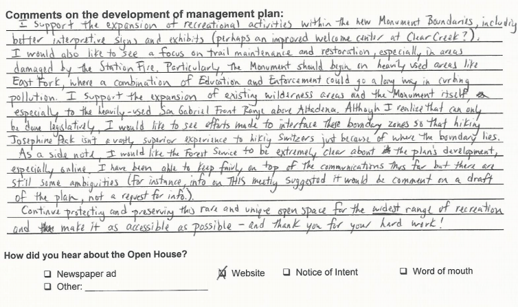 What they’re not telling you, though, is the reason they’re using the existing Angeles National Forest Land Management Plan is because they just finished an extensive public comment period on what will become the new San Gabriel Mountains National Monument Land Management Plan. The Forest Service expects to have a draft of the new Monument Management Plan by this winter, after which the public will get another 45-day period to comment. After that, there’s another revision period, and an objection period before the Plan is finalized. The Forest Service is estimating this process to be completed by Winter of 2016 or Spring of 2017.